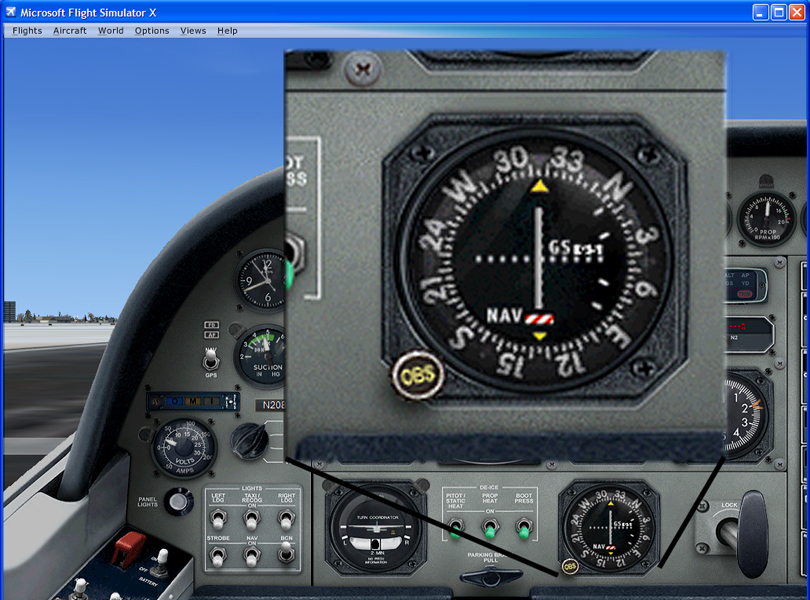 The VOR2 gauge contains 2 needles. The vertical needle is anchored at the top-center of the gauge and the horizontal needle is anchored at the left-center. These needles tell you where you need to fly to follow the ILS. As you can see from there being two needles involved, the ILS actually has two parts. The localizer provides left-right guidance and the glideslope provides up-down guidance. During your ILS approach you will be descending towards the runway so the glideslope will show you the angle needed to descend to the runway properly. Keeping the needles centered means that you are on the right track.